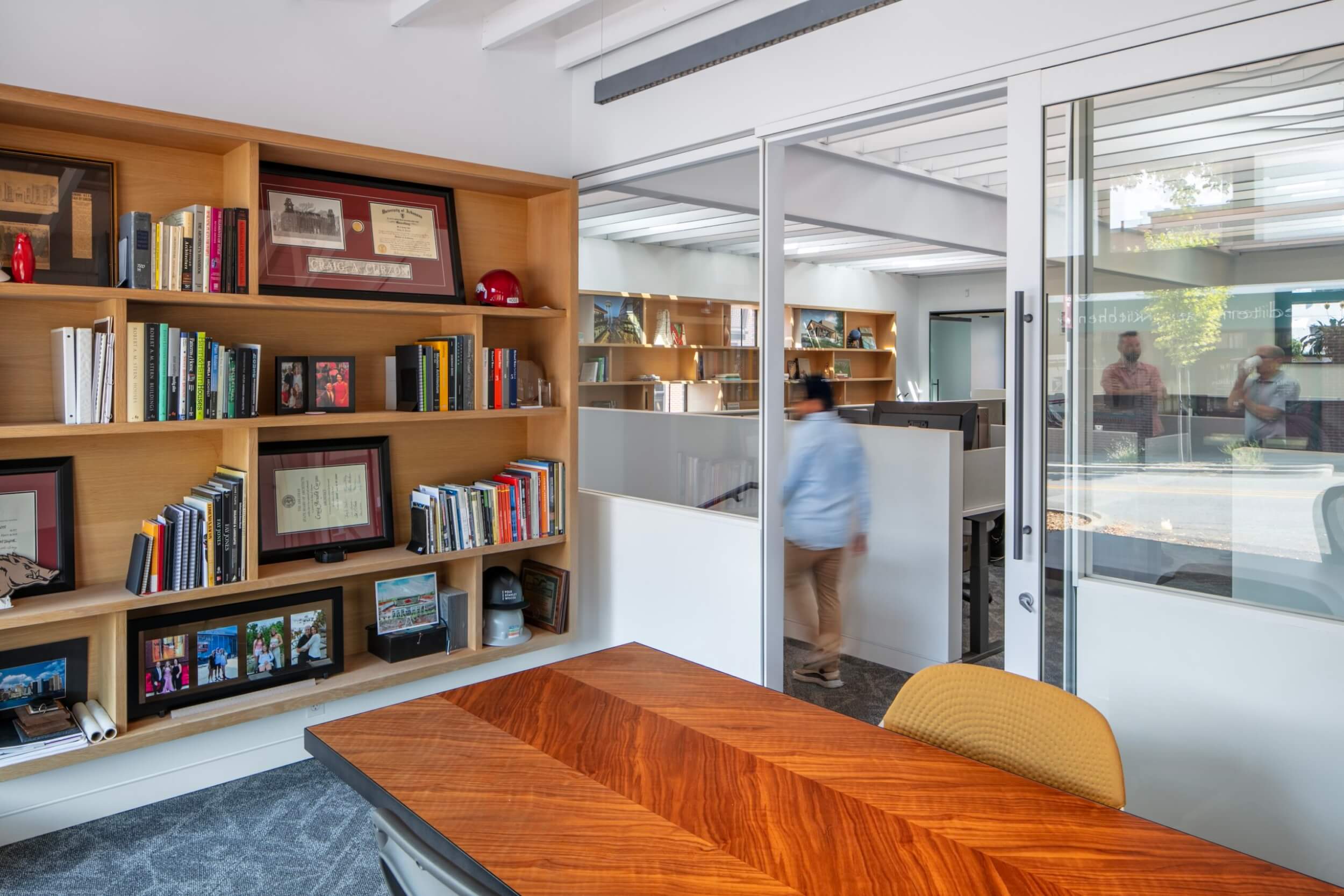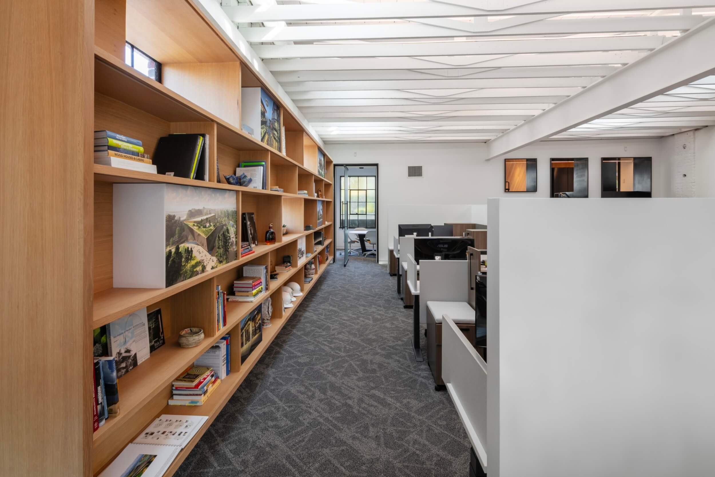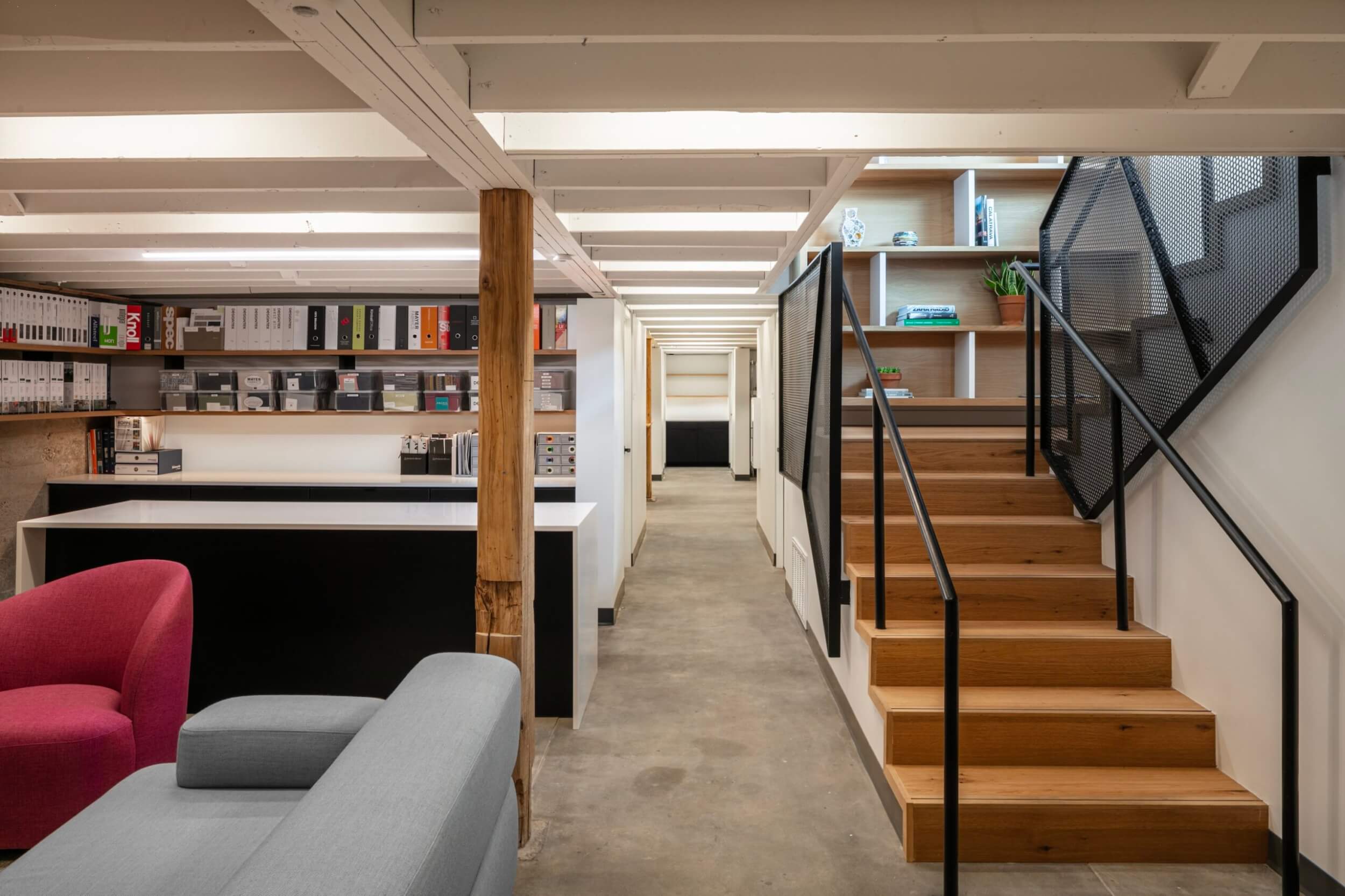The interior takes some liberty in order to provide an open studio environment between what were initially two separate spaces. Today, the Rathskeller maintains its location and namesake and now serves as our Interiors Library and an extension of our employee workspace and lounge areas.