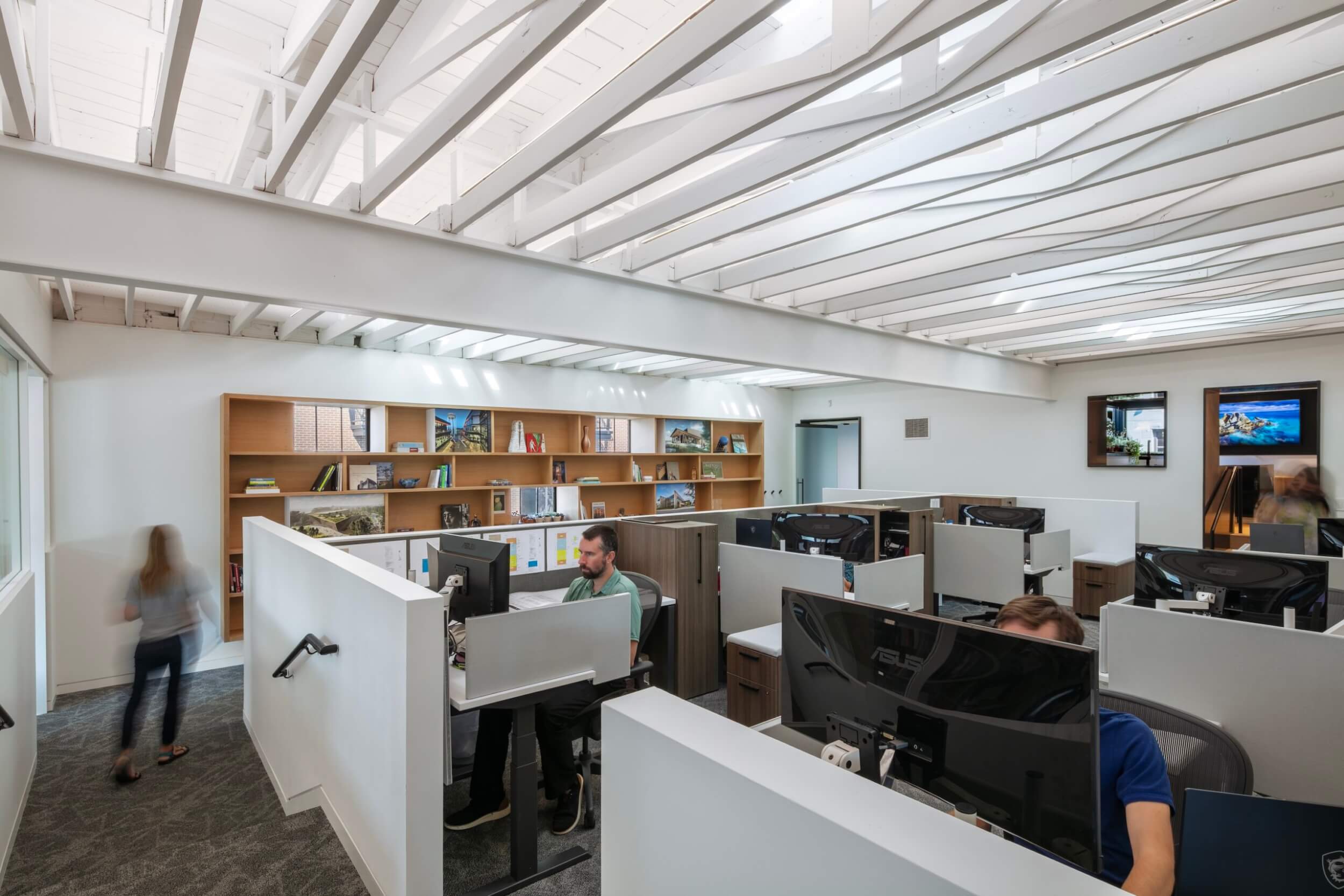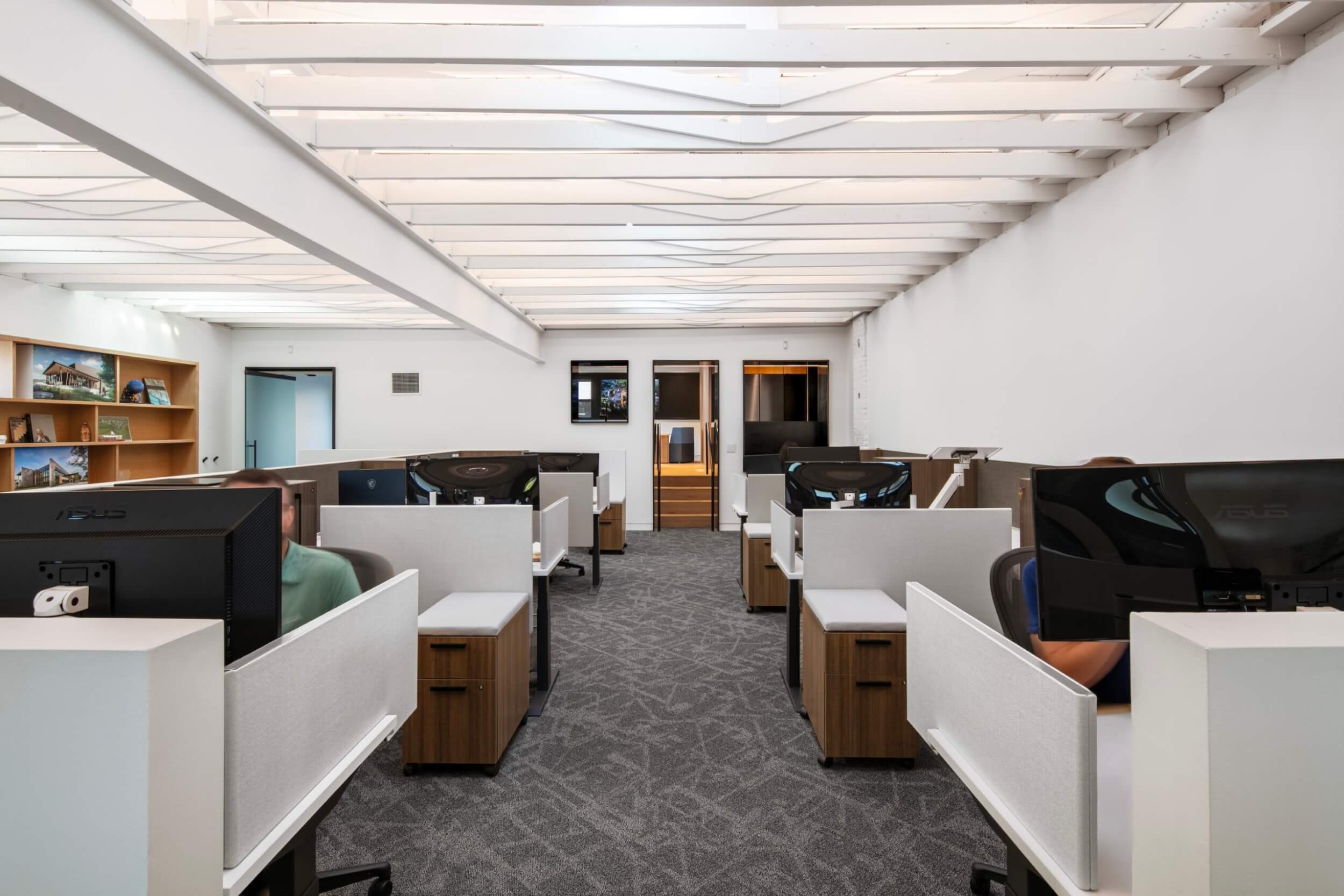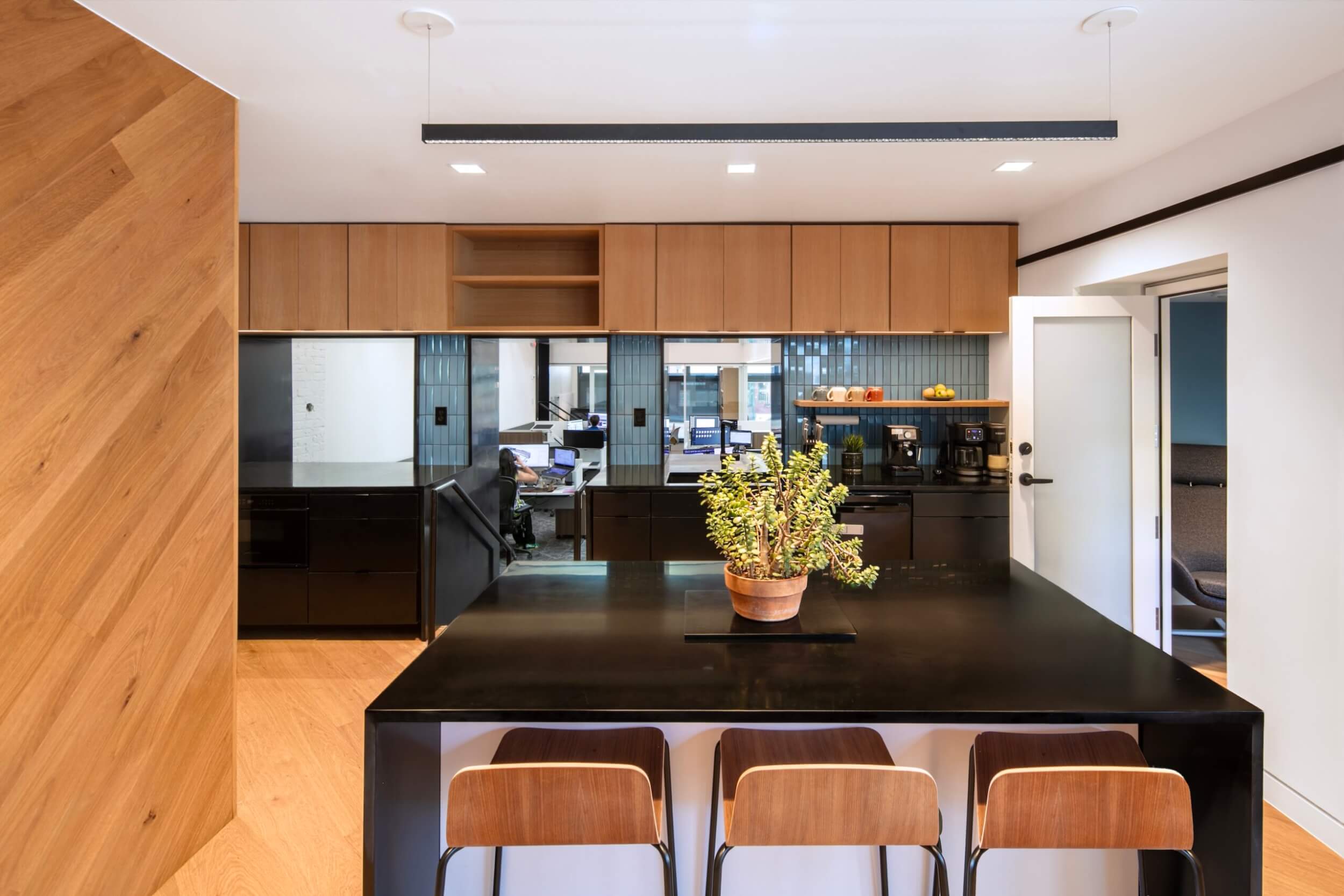 The interior takes some liberty in order to provide an open studio environment between what were initially two separate spaces. Today, the Rathskeller maintains its location and namesake and now serves as our Interiors Library and an extension of our employee workspace and lounge areas.