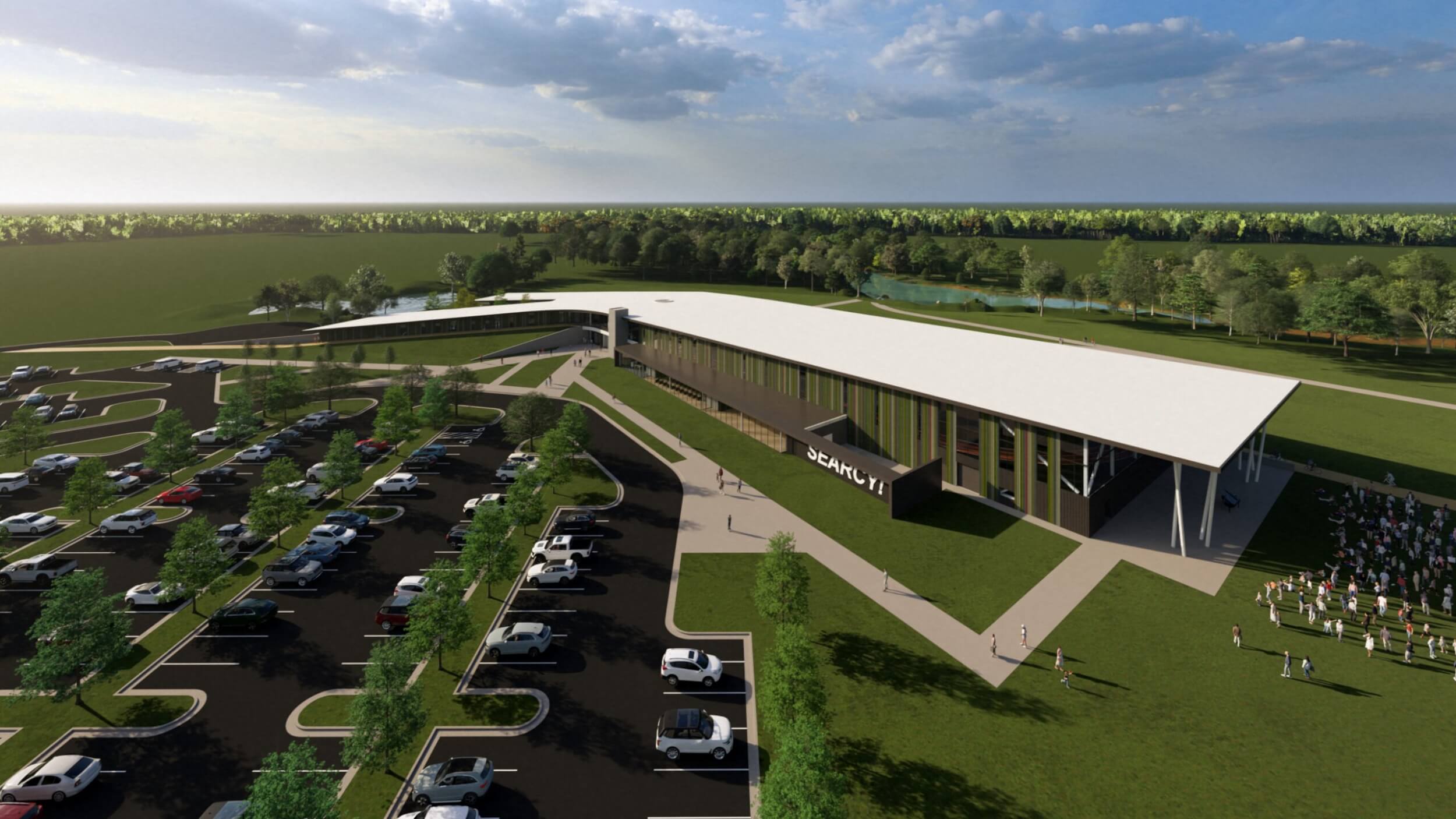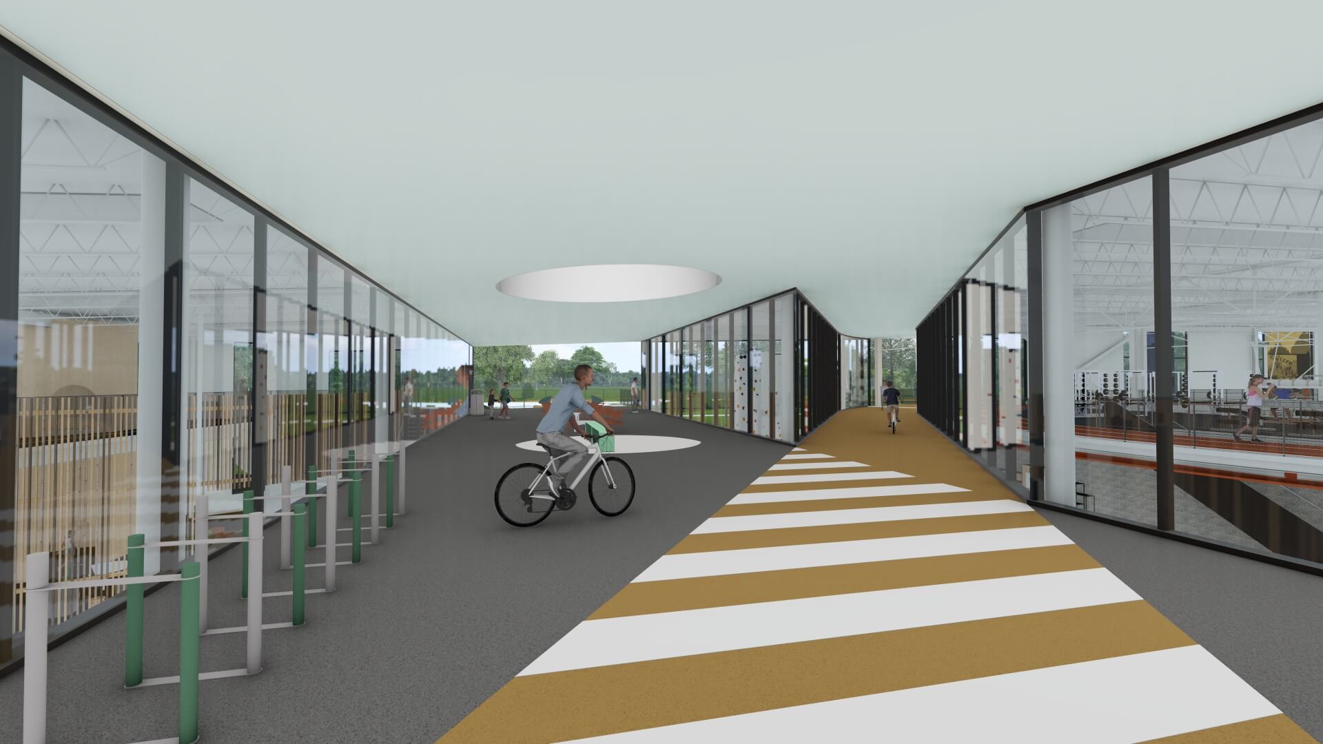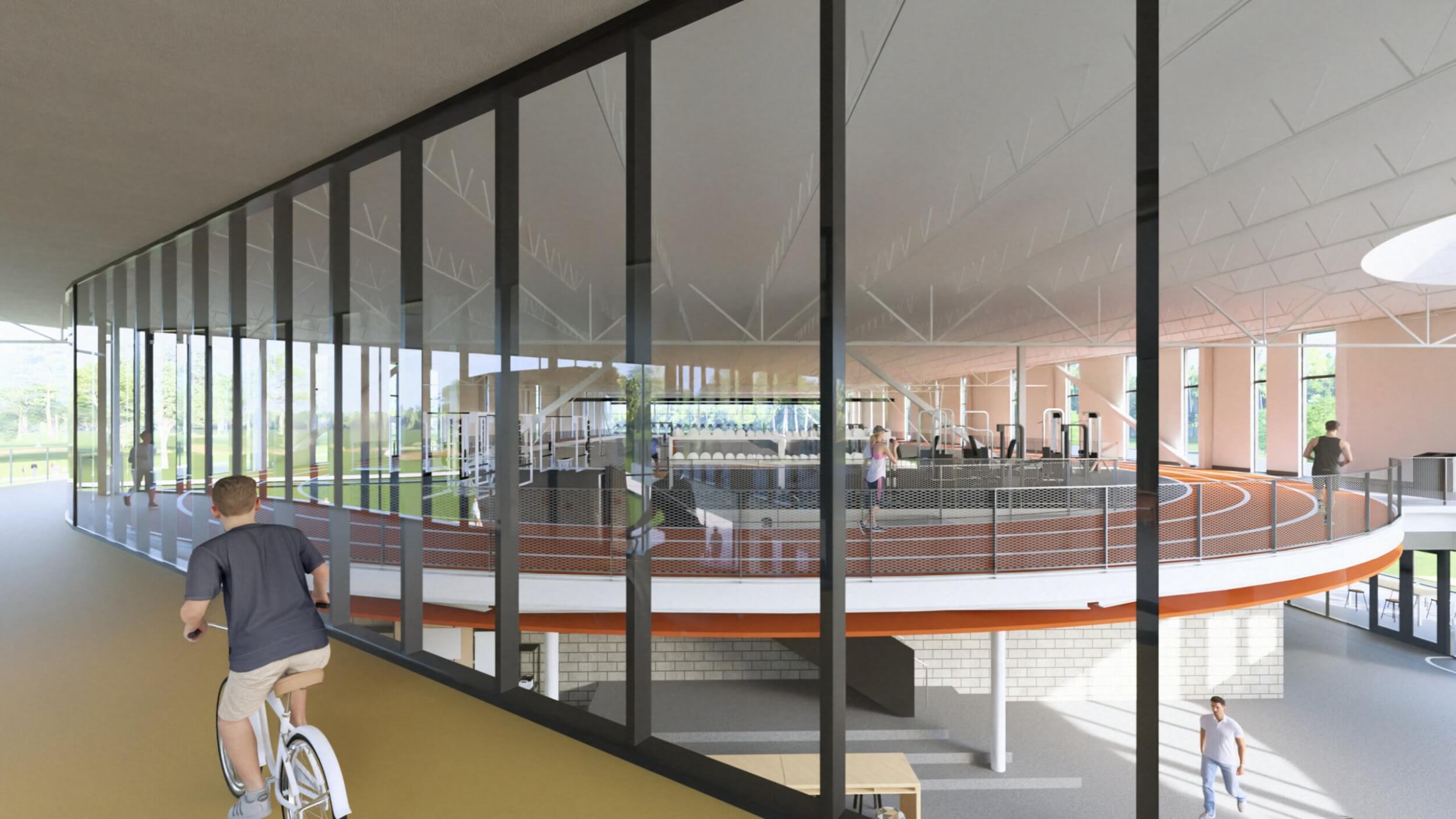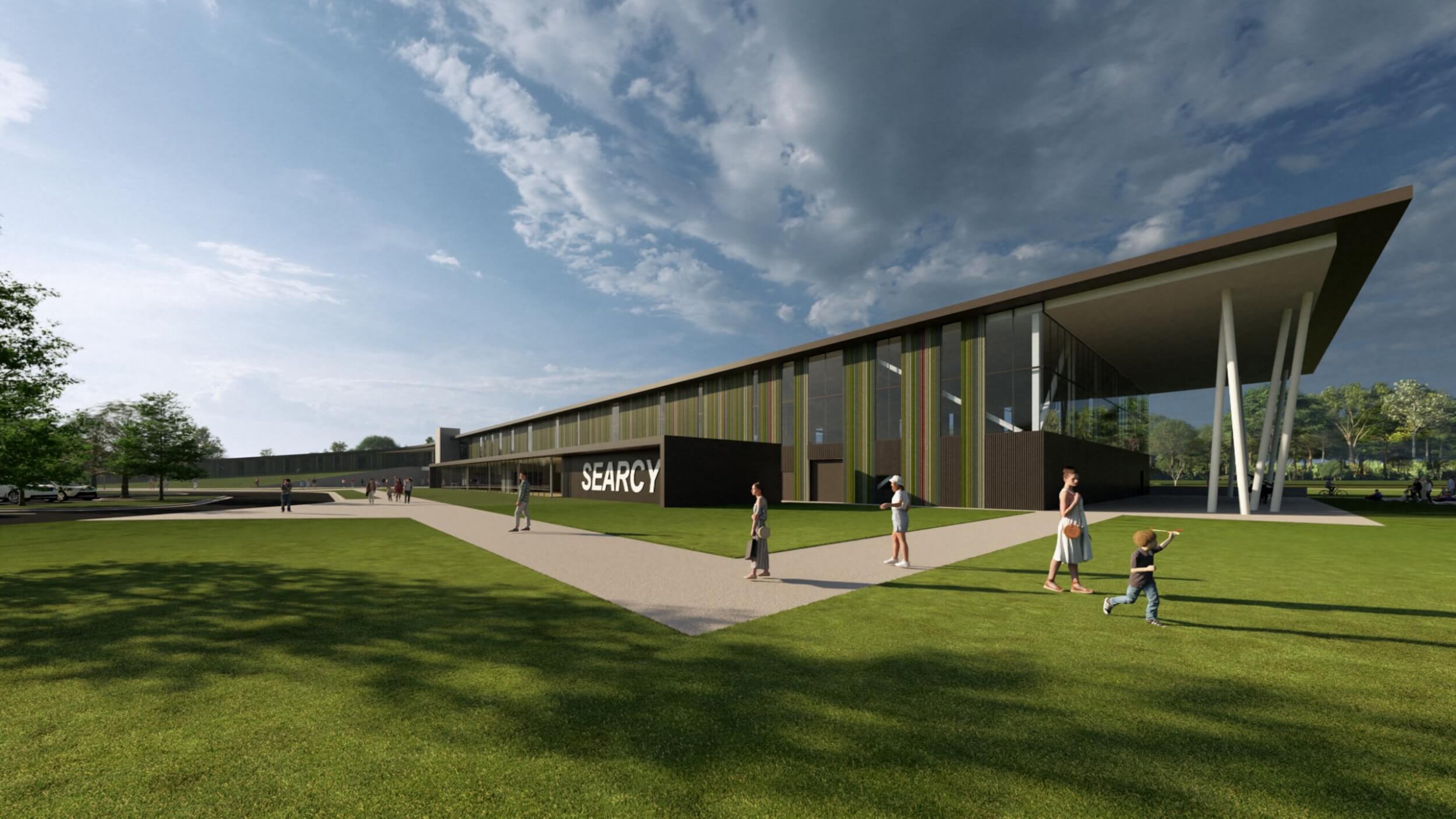 As part of an $80M overall transformative project, the new Searcy Community Center is a vibrant new space designed for all ages to connect, learn, and grow together. The building interacts with the expanding trail system and beautiful site to make it part of the building by taking bikers and runners dynamically up a ramp and though the building lobby, floating above and visible.