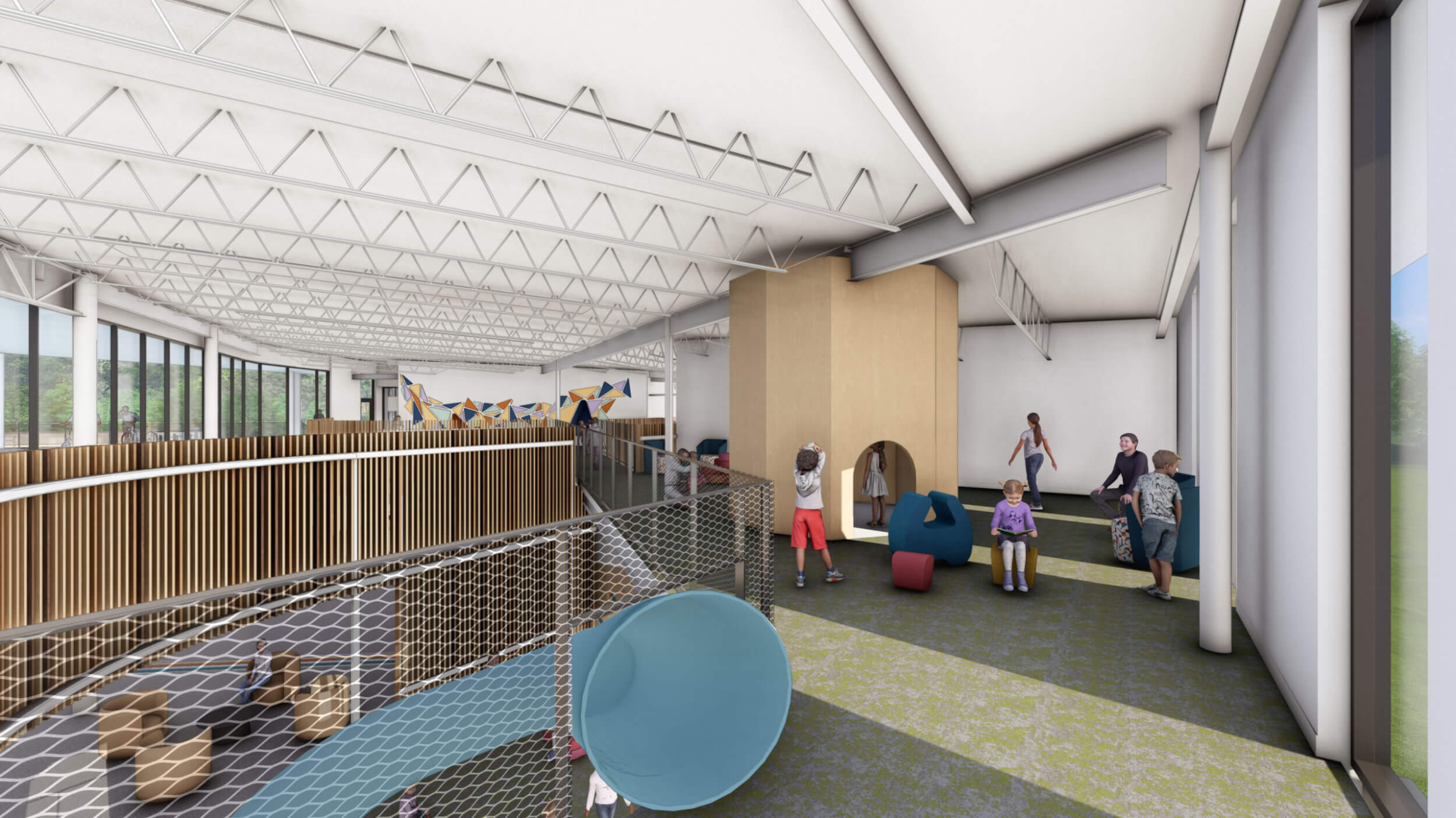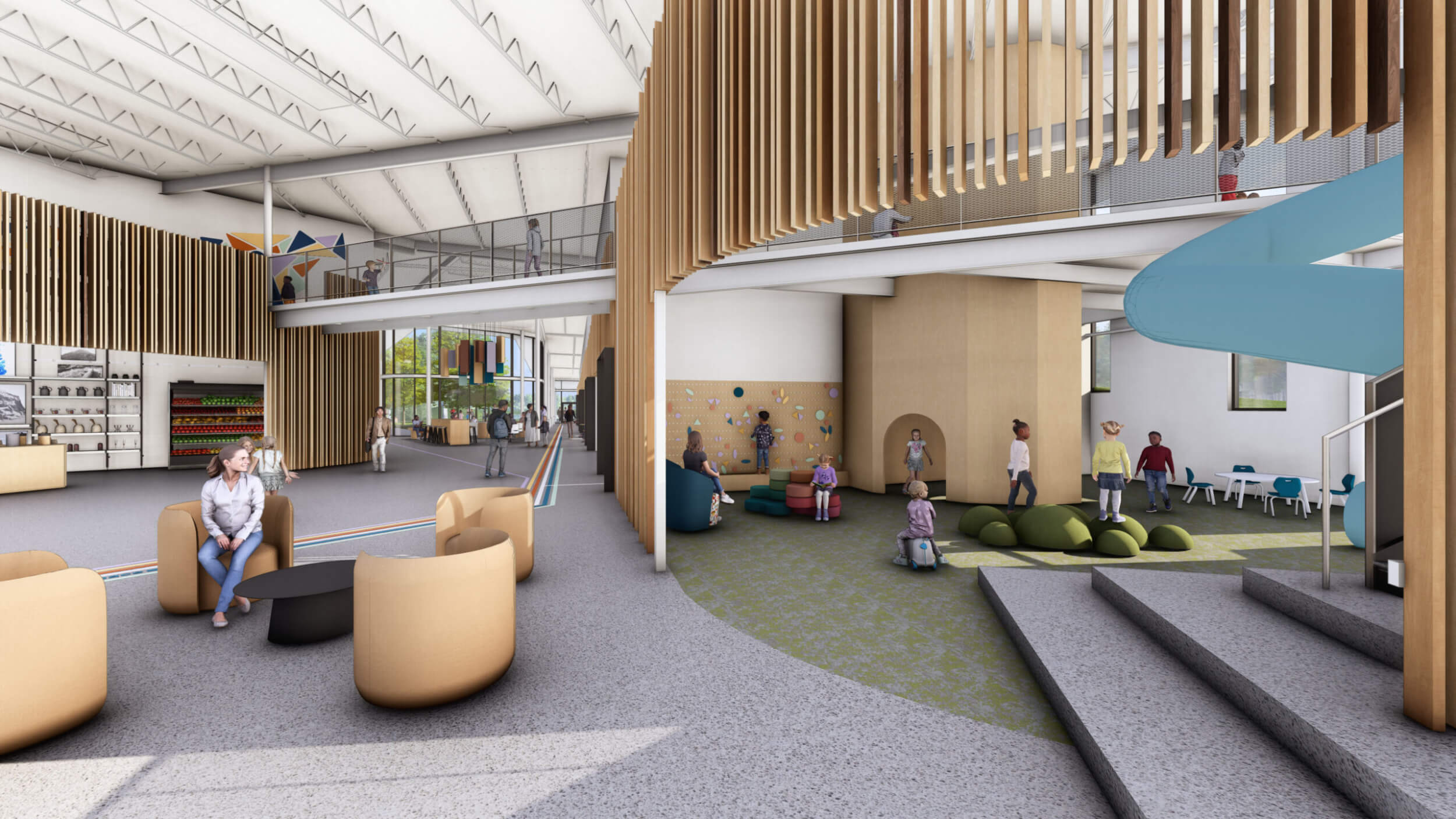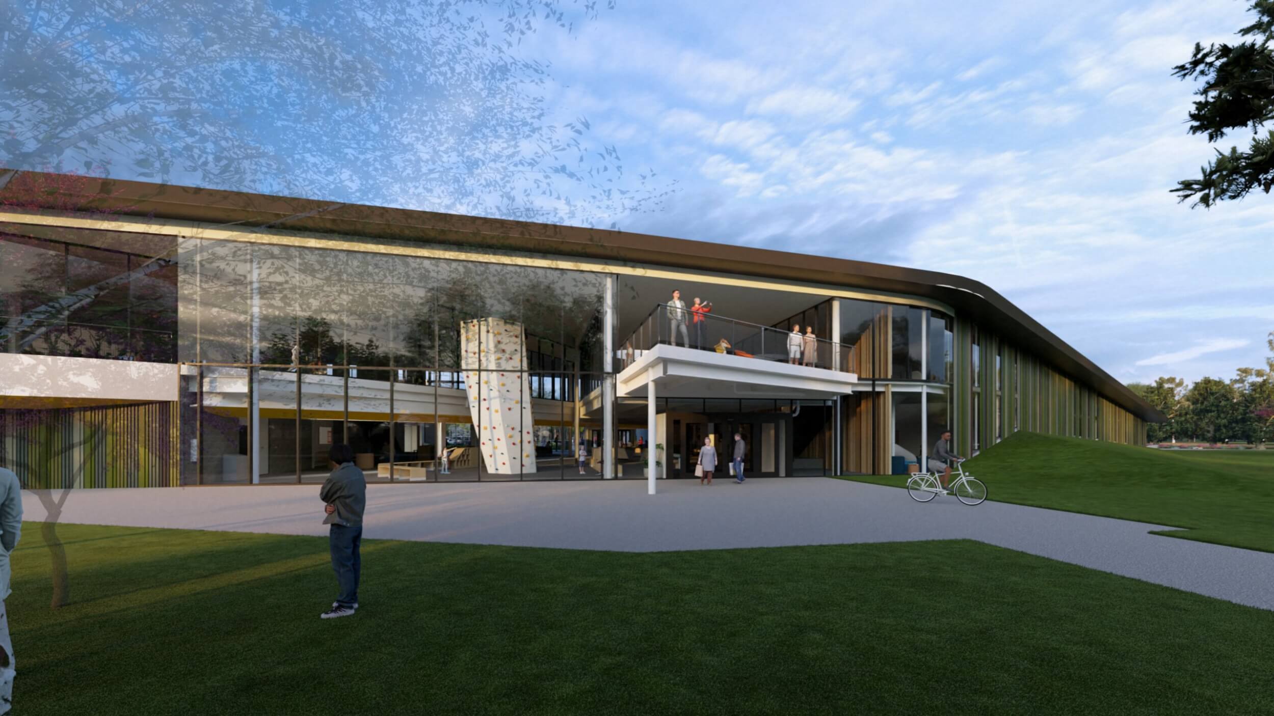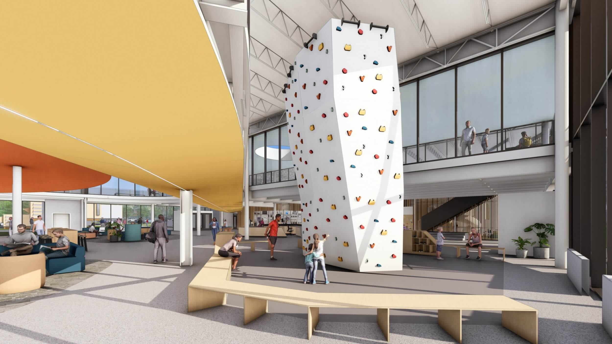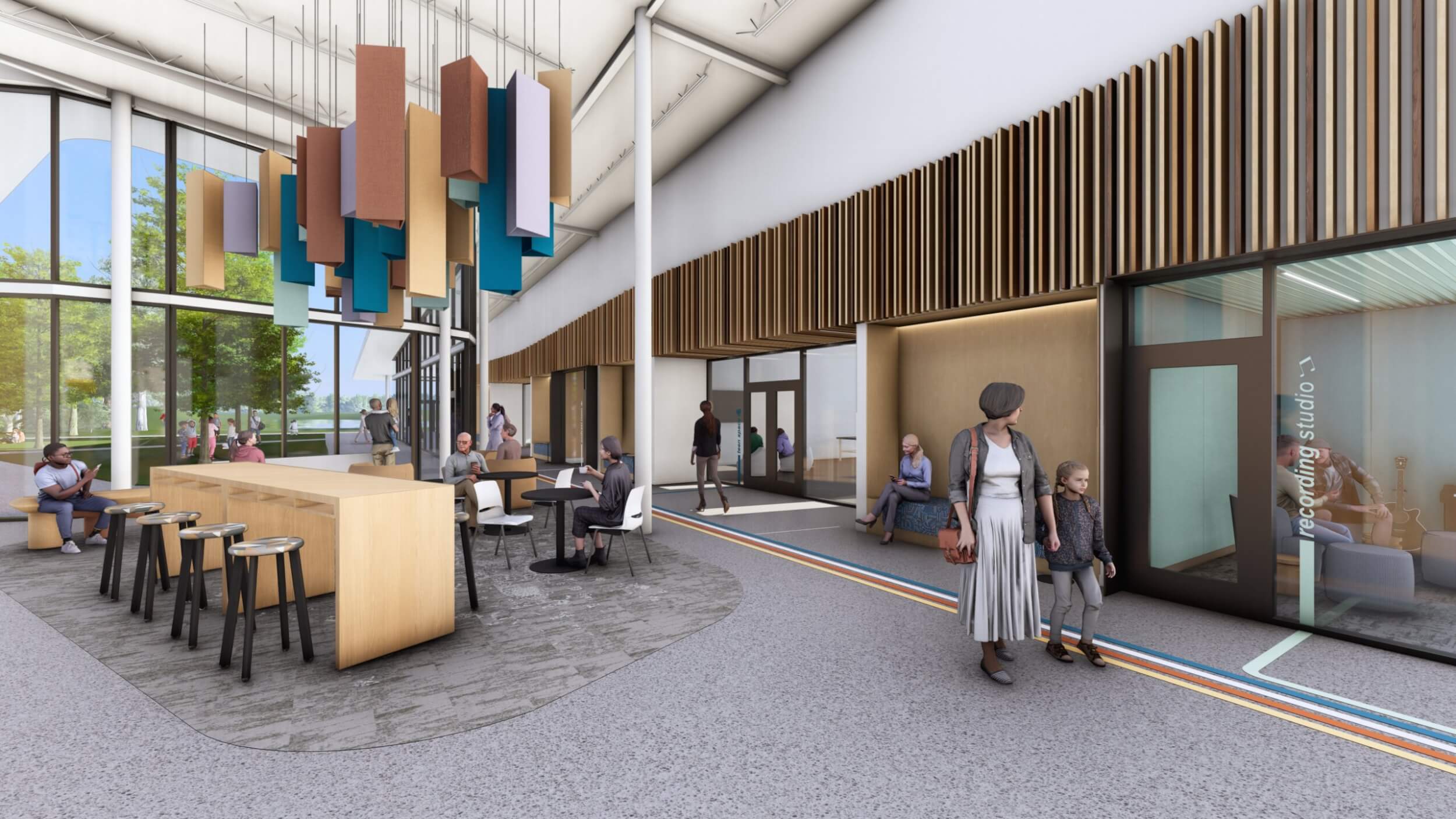 As part of an $80M overall transformative project, the new Searcy Community Center is a vibrant new space designed for all ages to connect, learn, and grow together. The building interacts with the expanding trail system and beautiful site to make it part of the building by taking bikers and runners dynamically up a ramp and though the building lobby, floating above and visible.