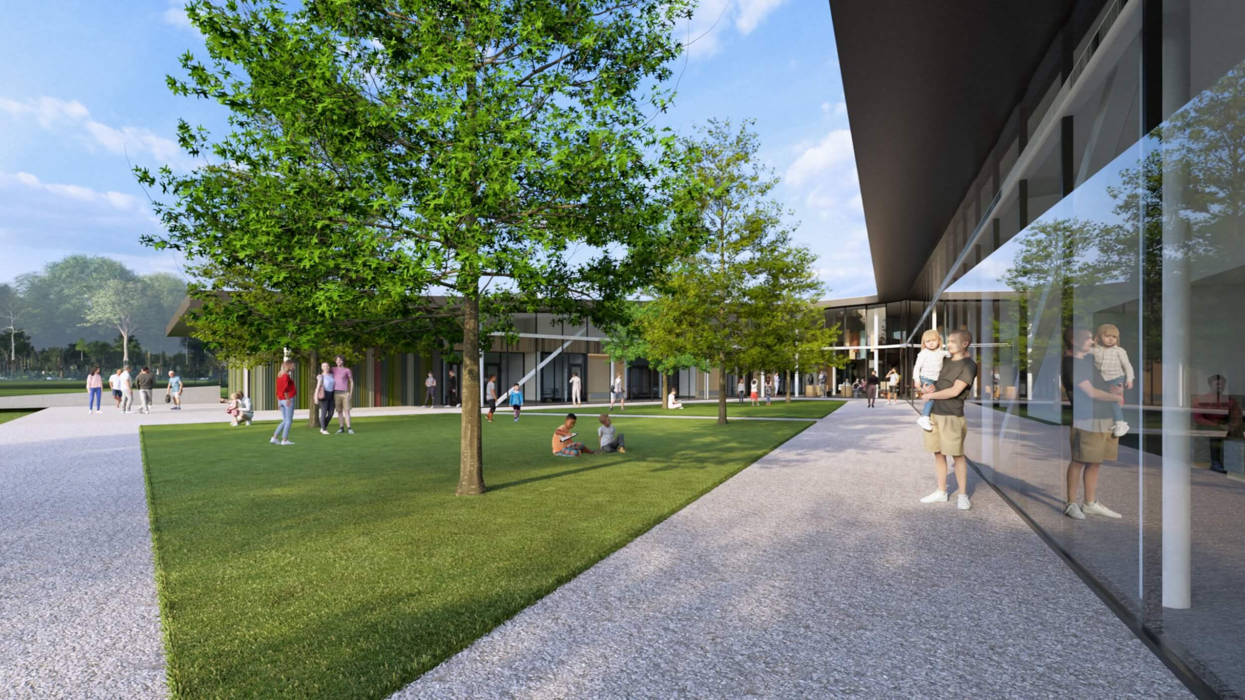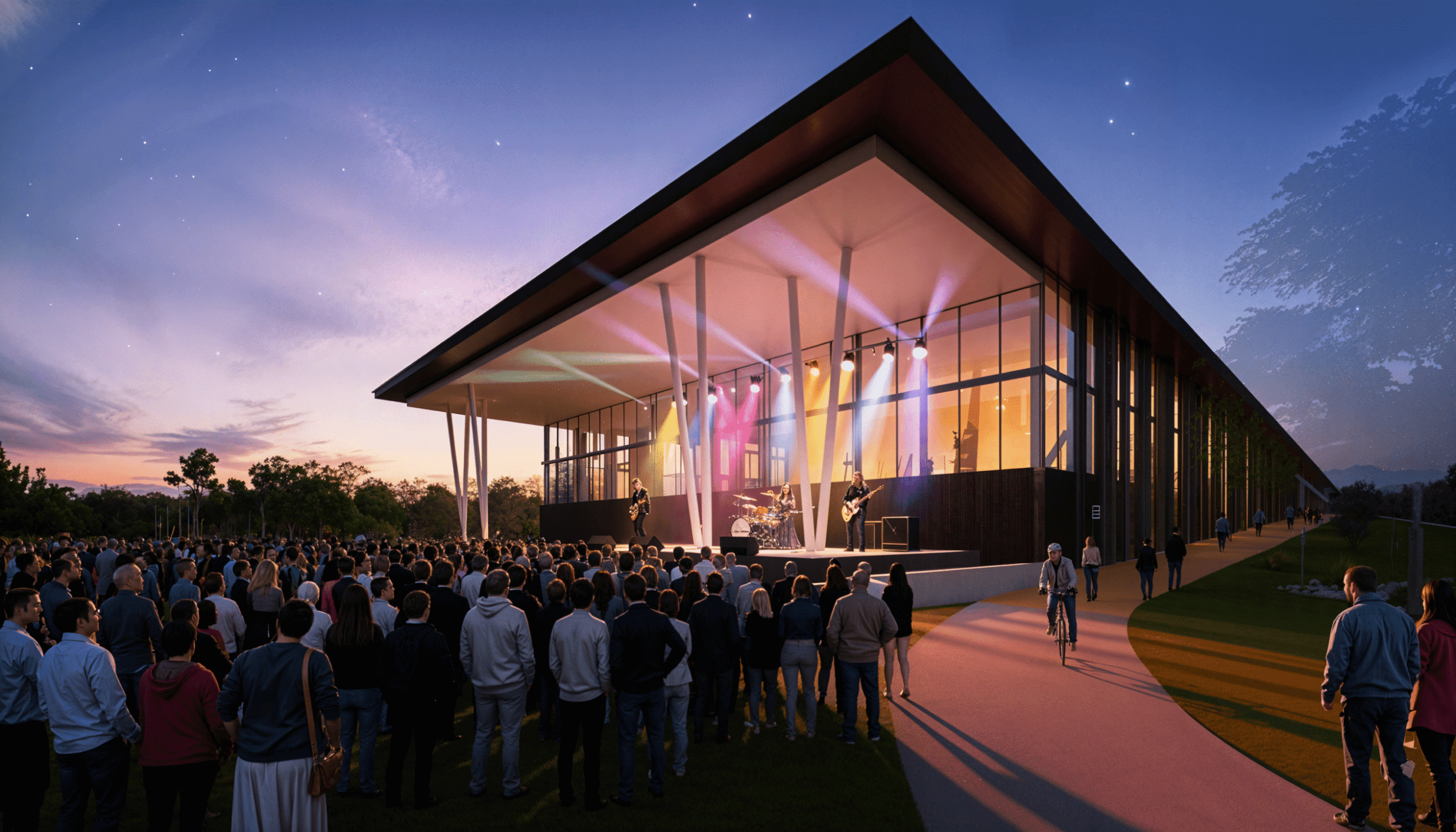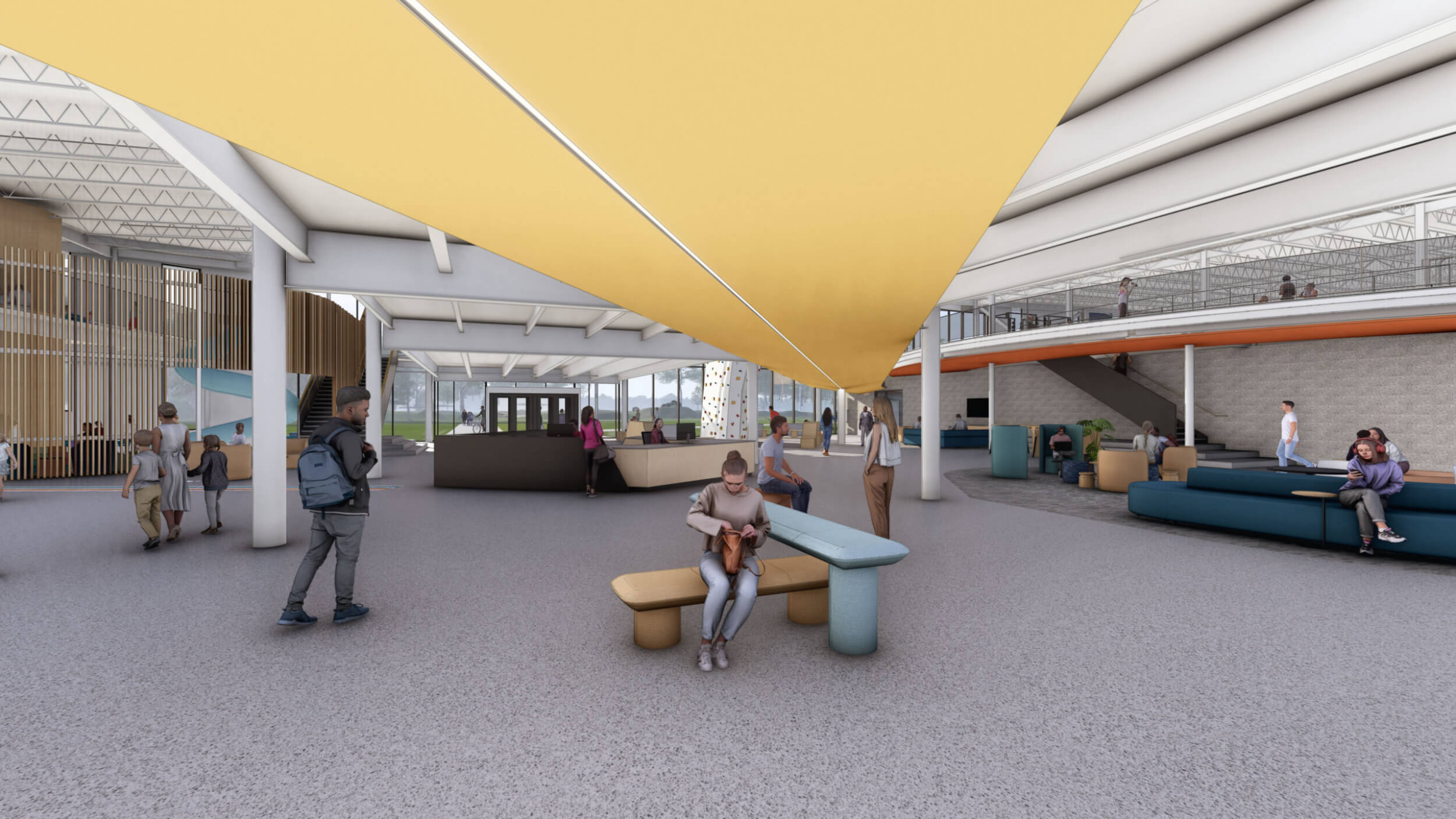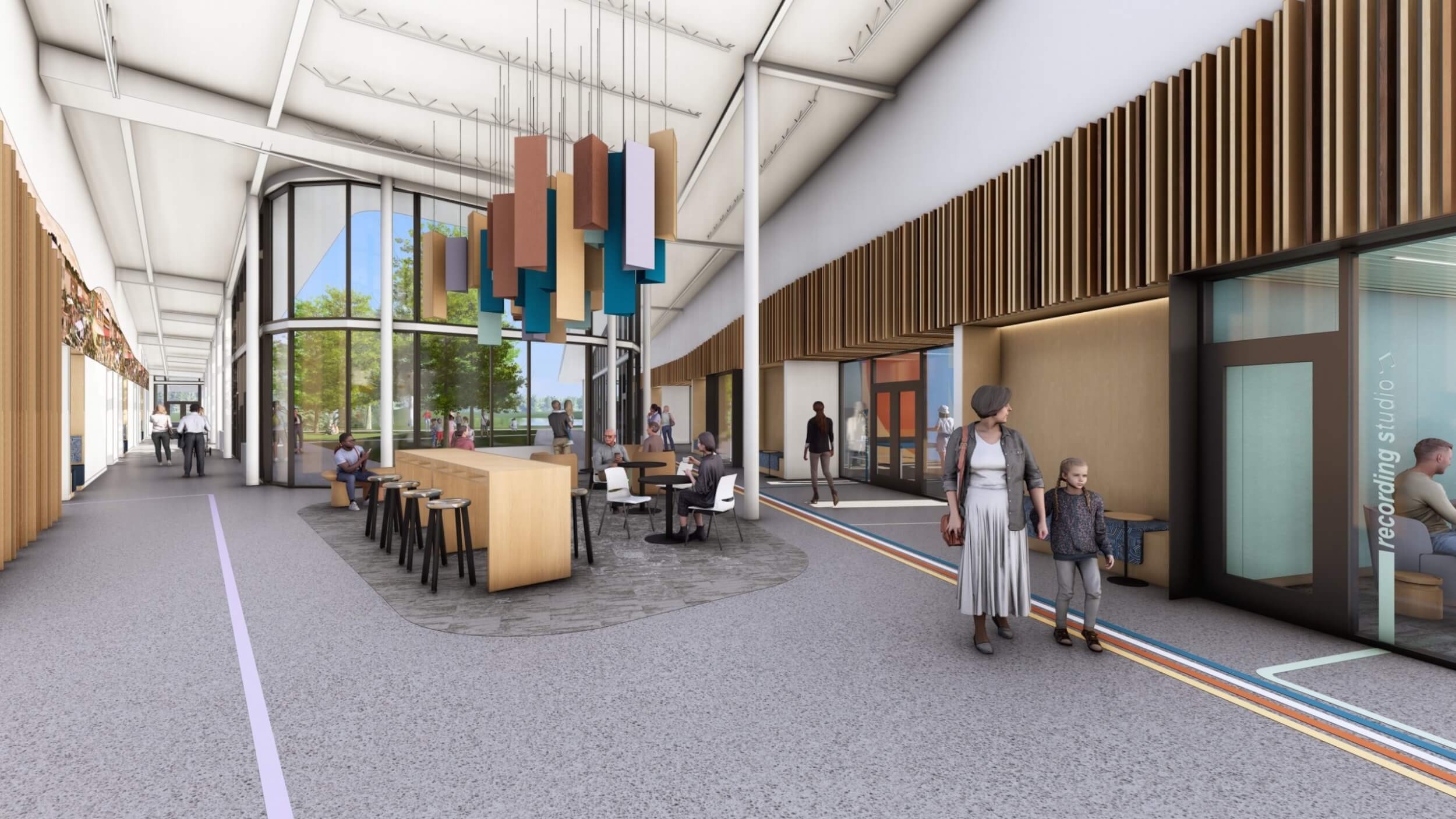 As part of an $80M overall transformative project, the new Searcy Community Center is a vibrant new space designed for all ages to connect, learn, and grow together. The building interacts with the expanding trail system and beautiful site to make it part of the building by taking bikers and runners dynamically up a ramp and though the building lobby, floating above and visible.